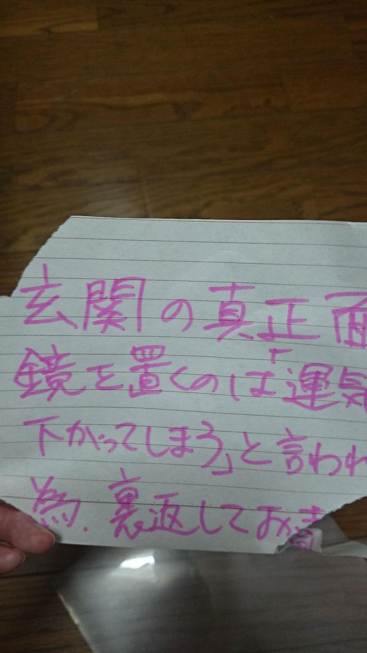 「玄関の真正面に鏡を置くと運気が下がると言われているため、裏返しておきます」