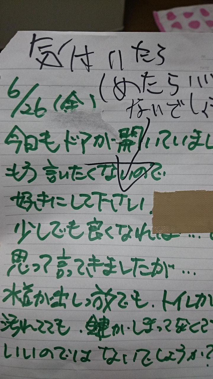 さすがに私も貼り紙をはがして大家さん(やその知人方々)に「前々からこういった貼り紙を勝手に張り付けている、みんな我慢して何も言わないけど、困っている」ということを報告。